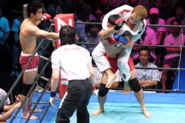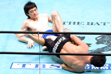 組合せはくじ引きで決定。ボールの入った箱の穴が小さく、グローブを外さないと手が入らないというハプニングも。選手のコーナーが決まると、ZSTガールが腕を組んでそのコーナーまで選手をエスコートするという、小技な演出も効いている。 試合は村田×出口、志田×山澤が2度ずつ繰り返される展開に。村田×出口の攻防は、初回は出口が道衣を使ったスリーパー、2回目は村田がヒールで攻める展開となるが、どちらも自軍コーナーに逃れてタッチするという内容に。志田×山澤では、前田吉朗とも接戦を繰り広げたことのある志田が、素早いタックルで上になり、何度もグラウンドで主導権を握るという展開に。山澤は日体大時代にボクシングで国体3位の成績を残しているが、志田はスタンドでも少林寺拳法4段の経験を活かし、ほぼ互角に打ち合っていた。 最後は志田が山澤にアキレスを仕掛けたところで時間切れ。急造チーム同士とは思えない息の合った展開となり、観客を飽きさせなかった。