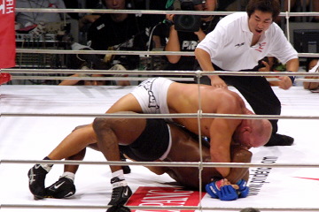 元UFCミドル王者はこれが三度目のPRIDE上陸。対する中村は先月末の武士道4でのメインから連戦状態だが、評価の低かったそのホジェリオ戦の汚名返上の意味もある。本年度屈指のスーパーイベントとなった今大会のオープニングマッチであり、来年に予定されるミドル級GPの出場権をかけた一戦と言われるだけに、両者ともに試合に賭ける意義は大きい。 ゴングと同時にパンチで飛び込んできた中村に対し、ブスタマンチはスカしてすばやい胴タックルでテイクダウンに成功するとハーフガードに。中村は隙を突いて立ち上がる。リセットされた戦いだが、またも中村の左フックはかわされ、序盤そっくりの形でタックルの餌食に。だが、ブスタマンチのねばっこい押さえ込みを押し返す形で、中村はロープを背に立ち上がることに成功する。