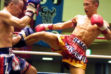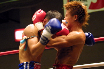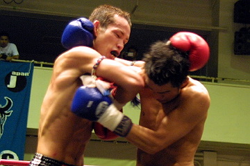 序盤から前に出るヨシに対し、喜入は下がりながら右ローを着実に当て、落ち着いた試合運び。首相撲になるとヨシは膝を連打し、ムエタイの本場での鍛練の成果を見せるも、喜入は突き離して右肘の連打。これがヨシの額を切り裂き、ドクターストップがかかった。 ムエタイのお株を奪う肘で見事勝利した喜入。マイクを持つと、J-NET代表として来年は他団体へ侵攻していくとアピールした。今大会はJ-NETの元エース・増田の“里帰り”の方が注目された。しかし喜入が“里帰り”する頃、喜入がJ-NETの現エースとして大歓声で迎えられるようになっているか?それは喜入の頑張り次第となるだろう。(井原)