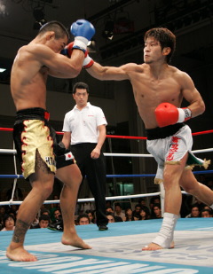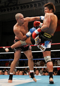 日の丸を肩にかけ日本刀を脇に携え入場した桜木裕司。この入場シーンには観客も大喜び。リングインする桜木に四方八方から声援が飛んだ。「地味な入場シーンで試合も地味。そういう観客の印象に残らない選手が多い中、桜木選手は雰囲気もある。(リングインして)彼を見たら燃えた」という西田は、リングインするとそのまま桜木に向かって駆け寄り挑発。試合前からいいムードが場内に漂う。 序盤は西田が左のミドルで桜木を追い詰め、キックのチャンピオンの意地を見せる。2Rはさらに左のローも加わり圧倒。桜木がこれで足をひきずるシーンも見られ、試合はこのまま決まるかに思われた。 しかし桜木がここから脅威の粘りを発揮する。西田が爆弾を抱える膝を右のインローで破壊すると、さらにパンチの連打で追い詰め形勢逆転。この桜木の反撃に観客席はさらにヒートアップ。試合は延長戦に入った。 両者の意地がぶつかりあった延長戦は、1ラウンドでは決着がつかず再延長戦へ。 「延長はあまり経験がなかったので(※2度目)、こんな疲れるのかって思った」と試合後に素直にスタミナ切れを認めた西田。桜木はそんな西田をローでさらに追い込み、パンチの連打で一気に攻めて逆転勝ち。試合後にはお互いに「試合をしていて気持ちよかった」と健闘を称えあった。 控え室に戻った桜木は「ベルトを賭けてくれるなら再戦してもいいけど、それに固執するつもりはない。むしろPRIDE武士道の関係者に『キックのチャンピオンに勝った総合選手を使ってみませんか?』とアピールしたい」と今後の抱負を語った。(永田)