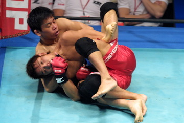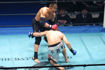 所は下になると腕十字や足関を仕掛けるが、大石はセコンドのアドバイスを聞きながら落ち着いて対処。スタンドのパンチの打ち合いでストレートを浴びても、うまくグラウンドに持ち込み、決定的な場面を作らせない。 2R開始早々、所のローのカウンターに合わせて大石の右ストレートがヒット。いったんグラウンドになり、スタンドに戻ると、所は疲れた様子を見せ始め、大石は首相撲に捕まえてのアッパーと膝蹴りの連打で倒しにかかる。グラウンドに持ち込むと、バック、腕十字とチャンス。所は足関狙いで上になり、ブレイクがかかると、スタンドで右フックを当て反撃。かろうじてドローに持ち込む。 延長ラウンドも接戦に。序盤は互いに足を取り合い、スタンドに戻るとパンチ合戦。所はタックルでテイクダウンし2度上になるが、その先の攻め手に欠く。判定は割れ、大石に軍配が上がったが、実質ドローに等しい大接戦だった。