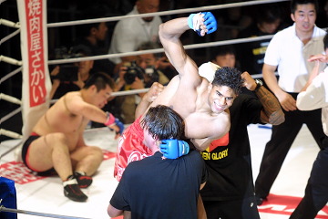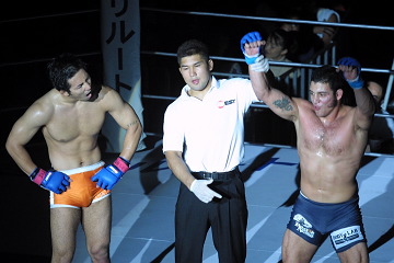 ◆江「勝ったという結果より、判定で勝てたという事実の方が悔しいです。本当は打撃を当てながら、タックル取って、そこからパスガードで攻めて…って考えてたんですけど。相手は腰も重たかったし、タックルをすごい警戒していて、カウンター狙いでの パンチもあったのでやりにくかったです。 (1Rでマウント状態になった時は?)パンチでラッシュをかけてTKOを狙ってました。チラチラとレフェリーを見ながら、TKOとってくれないかなっていうアピールもしたんですけど…。もっと冷静になってチョークを狙いにいけば良かったかなと思います。 (今後の課題は?)全体のスキルですね。下になっても上になっても、関節なり、打撃なりで徹底的に極められる決定力ですね。練習だと、相手がある程度極めやすい様に体を入れさせてくれるんですけど、試合の裸で汗かいた状態では、なかなかチョークやら腕十字は極められないので、もっと試合に即した練習をしないといけないと思いました。 (PRIDE出場は見えてきた?)正直、辛(から)いと思いました。出させていただきたいのは山々なんですが、自分に自信がない間に出て“かませ犬”になるよりは、キャリアを積んでから出てファンの方々の期待に応えたいと思います。」