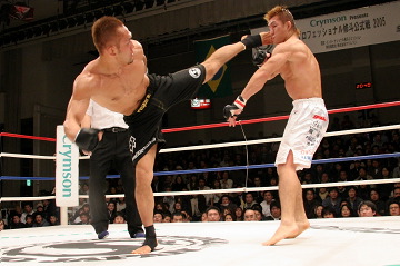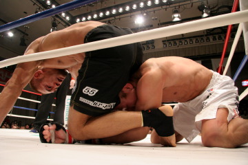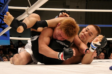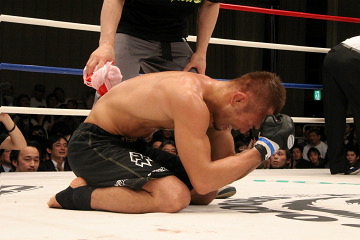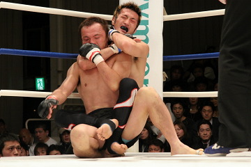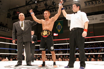 ●バックステージ「完全に捕らせないね。やっと捕ったって感じ。簡単じゃないですね。(ベルト奪取まで)何回かくじけそうになったけど四度目なんで…。三度失敗しているんで。(今回は)妥協しなかったですね。やるしかないと。 (試合を振り返って)いくらか雑な試合になっちゃたかな。(石川は)予想以上に硬い拳、重い拳でしたね。ガードしてても上から頭に響いてくるくらい。僕の十八番の横三角に行ったんですけど、お互いいっぱいいっぱいの所で勝ったって感じですね。もうあと1ミリで極まるって所で向こうも根性出して必死で逃げようとしてきたんで。ちょっとパワー負けしましたね。グランドでなかなか極めさせてくれないんで途中から打撃に切り替えました。 打撃は自然に出てきましたね。練習してきた事が、ようやく(試合で)出るようになったかなって感じです。剛術は半端じゃなかったです。予想以上のパワーと腰の強さでしたね。人一倍このベルトには思い入れが強かったんで三度も負けて…その気持ちの差が出たんじゃないですか」