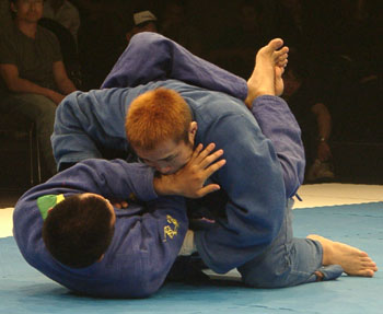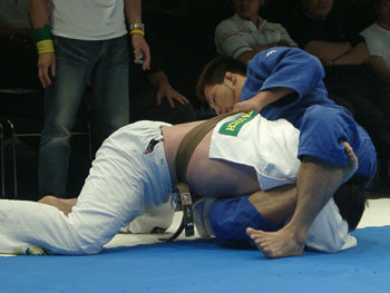 この緩んだ空気を最大に味方に付けたのは、実は片岡だったのかもしれない。“シェイク”でズリ落とされた形のガードポジションから、リバーサルとマウントの連続技を決め、ちゃっかり6ポイントを奪取。その後、懲りずに岡が三度目の“シェイク”を狙った時には十字に移行。最後は、引き込みからの三角を決めて、きっちりお笑いショーを競技に引き戻してみせた。(試合終了後、セコンドの偽ヨン様からズラを進呈されて、それを被ったまま勝利者撮影に応じた片岡も、相当“笑いのツボ”は押さえた選手だったようだ。)