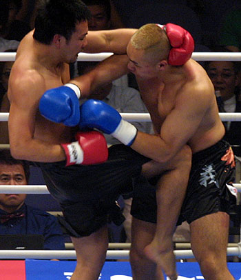 だが、既にサップは一回戦でフルラウンド闘った上でのこと、次第に“突進”の間合いが空き始め、ようやく堀にも攻撃のチャンスが巡ってくる。ワンツーから、蹴りのコンビネーションを当てると、サップの動きが止まる。