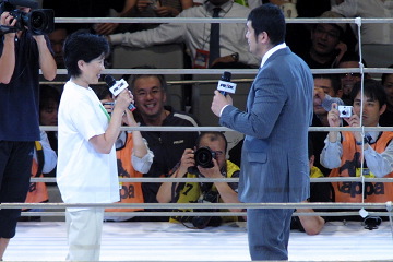 ◆ 小池百合子環境大臣がアピール 休憩前、小池百合子環境大臣がリングインし、地球温暖化防止キャンペーン「チーム・マイナス6%」のアピールを行った。今大会では会場の空調の温度を1度上げる、配布のビラに再生紙が利用するといった所でキャンペーンに貢献していた。