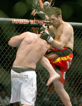 ホウガーの打撃、特に左ハイを警戒していたようにみえるボナーは、試合開始とともにいきなり相手の懐に入り込みフェンス際でテイクダウン。しかしLSU(ルイジアナ州立大学)のブラジリアン柔術クラブ創始者でもあるホウガーのルーツはやはりグラウンドでの攻防だ。ボナーをフル・ガードに捕らえるとすぐに下からアームロックや三角絞めで反撃に転じる。更には下からの肩固めで追い込むがこれを耐えたボナーが何とか上体を起こし、上からパンチと膝の連打。肩固めで決めようと1分近くもボナーを締めつけていたせいか、この時点からマウスピースが見えるほど口が開いてきたホウガー。明らかにスタミナ切れだ。 それでもボナーの上からのパウンドを凌ぎ、何とかスタンディングに戻したホウガーだが、リアクションの早いボナーはすぐにホウガーの首を抱え込むと顔面に膝蹴り、そしてワンツーのコンビネーションを当てる。