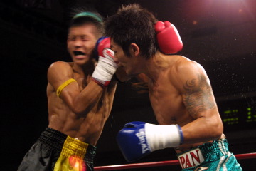 MA期待のスーパーツインズの兄・壮泰と、今ノリに乗っているチームドラゴンの成長株の梶原の対決は、この日一番の好勝負に。 元ボクシング東洋太平洋ランカーの梶原は、重みとスピードのある右フック、ストレート、左ボディで壮泰を苦しめる。とはいえパンチだけでなく、コンビでスムーズにローにつなぐことができ、キックへの適応度の高さが感じられる。一方の壮泰は梶原のパンチで一瞬顔をゆがめるが、それでも一歩も退くことなく、左右のミドルをバンバンと蹴り応戦。弟の山本佑機同様、ロー、膝、前蹴り等も使い分け、梶原に負けじとパンチを当てる場面も。 熱い打ち合いは観客のハートをつかみ、会場は「もう1R見たい」というムード。その期待どおり試合は延長戦に突入する。これまで同様、蹴りとパンチの勝負となりどちらも一歩も引かなかったが、ミドルを蹴りまくりヒット数で勝った壮泰に軍配が上がった。