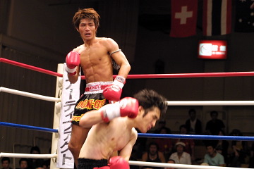 TOMONORIが今回戦うホワイトは、昨年11月に新日本キックのバンタム級王者(当時)の加村健一を下し、今年8月に同フェザー級王者の菊地剛介に敗れるも3R戦い抜いた選手。フライ級と小柄のTOMONORIは、53kgの契約体重と肘無しルールを望んでいたが、ホワイトは55kg・肘有りの要求を通した。 不利なルール。しかも所属ジム主催興行のメイン。厳しい状況の中、TOMONORIは1Rから右フックでダウンを喫してしまう。 だが「逆にそれで目が覚めた」といい、2Rからはコンビネーションを決め、「あえて視界から消える大きなモーションで打った」という左フックでダウンを奪い返す。 これでポイントは五分。その後も一進一退の攻防が続く。だがTOMONORIは3Rに前蹴り一発で大量の鼻血を誘い、5Rにはパンチの連打で追いつめる。要所でポイントを稼ぎ、見事逆転勝利をおさめた。 実力者ホワイトを55kg契約で下し自信を深めたTOMONORIは「全日本の藤原あらし選手とやってみたい」と発言。活性化しつつある軽量級戦線で華麗な一発を武器に今後さらに脚光を浴びることだろう。