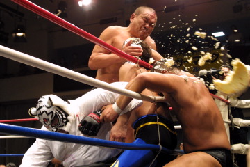 虎のマスクをかぶって登場した敏男会長は、他の選手より一回り小柄で、「小虎」といった雰囲気。敵味方関係なく他の3選手の反則攻撃の餌食に。だが途中から激励賞のワインを佐山氏に一気飲みさせられると、「大虎」に変身。獅子奮迅の大暴れをしたが、最後はお祝いのケーキを叩き付けらたところで和田良覚レフェリーがノーコンテストを宣告した。