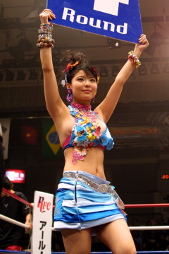 ■右写真:エキスパートクラスの試合では、グラビアアイドルの花井美里さんがラウンドガールを務めた。