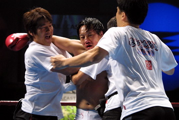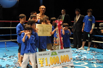 ◆水谷(リング上での質疑)「一回戦で消耗し、準決勝は仲間の板橋選手を短時間で倒した末広選手が相手で、正直びびったけど、セコンドの声もみんなの声援もよく聞こえました。ホント、あきらめなくて良かった。 優勝賞金(100万円)は大塚と大森で開講している『空手維新』の運営費に充て、自分も空手維新も成長させたいです。 10代の頃は悪ガキで、一人で僕を育ててくれた母親には5人分の面倒をかけました。32歳になってようやく親孝行できたかな(青コーナーのKAWASAKIから「あっぱれ!」という声が飛び、場内が笑いに包まれる)。 僕は27歳で格闘技を始めましたが、年齢が遅くても願いは必ずかなうことを、皆さん分かってもらえましたでしょうか? 仕事等で色々あると思いますが、みなさん夢をかなえましょう!」