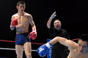 1Rはやや慎重に見えた上松だが、2Rから膝蹴りと左ボディを当てるようになると主導権。3Rには度々コーナーに追い詰め、パンチと膝で加護を苦しめ完勝した。