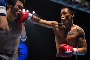 ゴング前、ファイヤーが両脇を開いて腰を下げる独特の構えをいつものようにすれば、水谷は同じ構えで反対側のコーナーに立ちはだかり、観客を最初から楽しませる。 試合もお互いの闘志が前面に出る好内容に。1R、ファイヤーが左ボディと右ローを的確に当て主導権。2Rも同様の流れだったが、水谷が1Rから放っていた左テンカオをファイヤーの顔面にクリーンヒット。そこからパンチラッシュで一気に主導権を握る。 3Rも水谷が左ローの連打をきっかけに、パンチの連打でファイヤーを追い詰め優勢。ファイヤーも右アッパーを返す等、力を振り絞りパンチで応戦したが、あと一歩及ばなかった。