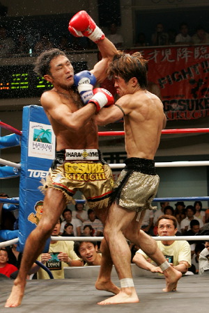 菊地は得意のローを打つ前に距離を詰められ攻めあぐねたが、3Rに右肘一発で岡田を切り裂き、かろうじて勝利をものにした。