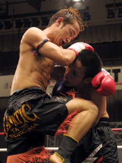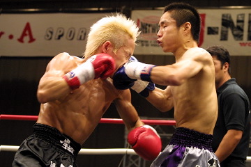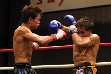 パンフレットで9人中7人の記者&カメラマンが本命に上げていたTOMONORIだったが、よもやの苦戦。左のハイやテンカオを当てるものの、破壊力が不十分で、その後の攻撃につながらない。野嶋の方もカウンター狙いだったのかもしれないが、自分から積極的に仕掛けようとしない。噛み合わない本戦で、両者目立った攻撃がなくエクストララウンドに突入。 飛燕の左ローでTOMONORIの足が流れる。ラウンド一貫して蹴り主体の攻めで、ポイント稼ぎの戦法か。TOMONORIは飛びヒザは不発だが、パンチが多い。延長戦も特に変わった動き無く試合終了。評価の難しい内容だったが、わずかな手数の差でTOMONORIに軍配が上がり、優勝候補として首の皮一つ繋がった。