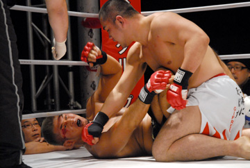雷暗がパンチをかわしてタックルで上になると、サイドポジションで相手の腕を自分の足で固定し、逃げられないようにしつつパウンドを連打。相手に何もさせない余裕の完勝だった。