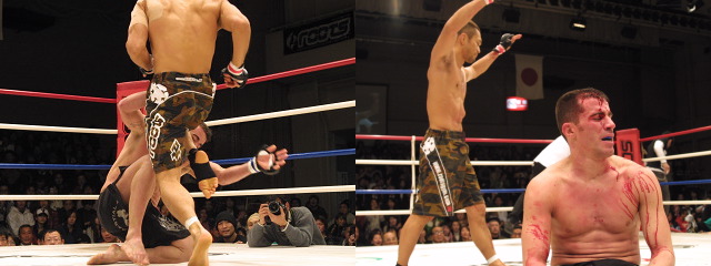 フライ級らしく、スピード感のある打撃の攻防の後、石井のタックルに合わせたシンヤの飛び膝がクリーンヒット。ダウンした石井は立ち上がったが、足元がふらついており試合を止められた。シンヤは兄・カツヤの04年のDEMOLITIONでの黒星の敵討ちを果たすとともに、プロ修斗デビュー以来3戦連続KO/一本勝ち。