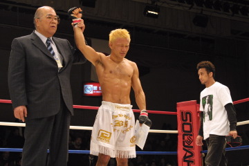ムッサルドのタックルを切った新美は、首相撲からの強烈な膝蹴りを中心とした打撃で圧倒。2Rにはマウントとバックから攻め続け、ムッサルドの気持ちを折り快勝した。