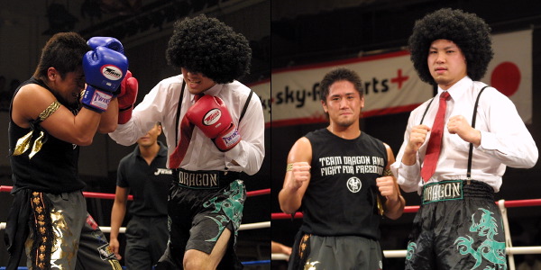 「いつもはふざけないのでふざけてみた」という澤屋敷は、アフロのカツラ、Yシャツ、ネクタイ、サスペンダーという謎のコスプレ。パンチを打つ度にズレ落ちるサスペンダーを直す姿がかわいらしい。尾崎もテコンドー仕込みの派手な蹴りを披露した。 尾崎は「来年のチームドラゴンクエスト2ではK-1のベルトを持ち帰ってエキシビジョンをしたい」、澤屋敷は「K-1で頑張って、チームドラゴンの名を広めたい」とマイクアピールした。