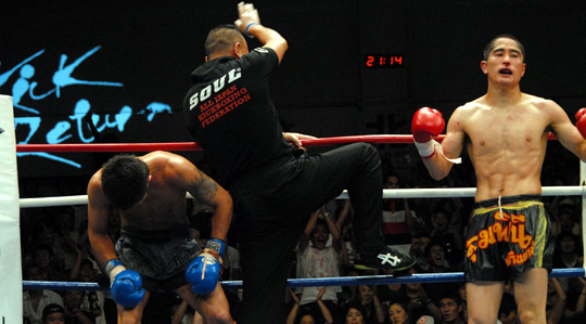 4Rまでの得点は五分か前田が1ポイントリードかといった状態。5Rも両者一歩も引かない死闘が続く。しかし底力では、国内屈指の練習量で知られる藤原ジムの前田のほうが上だった。5R目にも関わらず、左右のハイキックをヒット。そして左ミドルを梶原のレバーにめり込ませると、ついに梶原の動きが止まった。パンチの連打でスタンディングダウンを奪うと、最後も左ミドルを連打。戦意を失った梶原を見たレフェリーが死闘に終止符を打った。