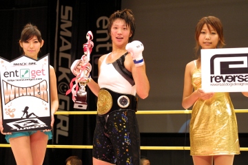 第8試合 スマックガール・ミドル級(58kg)女王タイトルマッチ 5分3R ×赤野仁美(AACC/第2代女王) ○端 貴代(和術慧舟會東京本部/挑戦者) 判定0-3 (和田=端/梅木=端/山崎=端) ※端が女王に