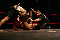 第6試合 総合ルール 70kg契約 5分2R ○勝木康智(GSB) ×日置和芳(EVOLUTION) 1R 三角絞め 勝木が右ローで試合を始める。組み合うと同時に勝木が引き込むと下に落ちながら三角絞め。しかしコーナーにジャマされブレイク。スタンドで日置がパンチラッシュで圧すと勝木は抱き付きクロスガード。日置は間髪置かずそのままバスター。ブレイクがかかりスタンドに戻ると再度勝木が抱き付き→バスターとさっきと同じ光景が。 しかし、落とされながらもまた勝木の足が日置を三角に取る。日置は三角絞めを解かずにパウンドで攻めようとするが、勝木の左足のフックが完全に掛かると両者が転げ、レフェリーがストップ。EVOLUTION陣営は第3試合同様、「止めるのが早い」と不満を口にした。