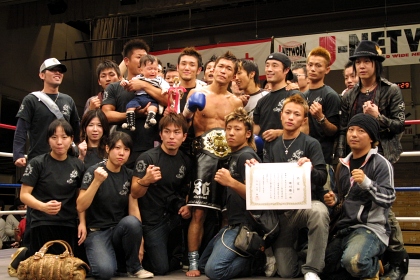 1R 1分過ぎ、小宮が得意のパンチで先手を取るが、寒川は狙っていたという右肘打ちで小宮の左まぶたをカット。この日セコンドにつき、アマ時代から共に練習している、SB王者の及川知浩を彷彿とさせる見事な一撃だ。 だが実績で勝る小宮は、ドクターチェックの後、右ローを連打で効かせて流れを引き寄せると、一気に距離を詰めてボディブローからのコンビネーションで右フックを当てダウンを奪取。2Rになると出血もおさまり、ローを効かせた後のパンチラッシュで主導権を維持する。 寒川は苦境が続くが、しぶとく肘で応戦し続けると、3Rには小宮のまぶたからの出血が再び激しくなり、3Rの間で2度ドクターチェックが入る。4Rに入っても出血が続き、通算4度目のドクターチェック。長時間止血が行われた末、最終的には少白竜レフェリーが試合をストップした。 寒川は35歳にしてベルト奪取に成功。神戸にジムを持ち、関西の他のジムと団体や競技の枠を超えて共に練習した成果であることをアピールした。