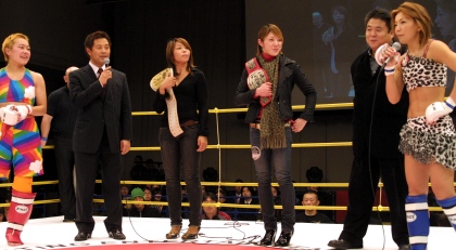 エキシの後はミドル級王者の端貴代と、DEEP女子ライト級王者のMIKU、DEEPの佐伯繁代表、スマックの篠泰樹代表がリングイン。「女子版・大連立」をアピールした。