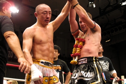 武田は開始すぐから鋭い右ローをヒット。足を止めてのパンチの打ち合いでも、クリーンヒットで上回る。パンチはウェインに「何度か星が見えた」、右ローも「タイ人よりも強かった」と言わしめるほど効かせたが、鼻血を出し顔を腫らすのは武田のほう。3Rに入るとローを嫌ったウェインは距離を詰め、ボクシングの特訓で磨いたというパンチの連打をまとめるように。武田は口と鼻の出血がひどくなりドクターチェックを受ける。 互いに消耗が激しくなってきた4R、勝負の時を迎える。武田は序盤からローを当て、左右のフックをクリーンヒットさせチャンスをつかんだかに思えたが、ウェインの左フックでついにダウン。さらにウェインがパンチラッシュを仕掛けると、ジャブ気味の軽い当たりで武田は力無く2度目のダウンを喫する。 グロッキー状態になっても武田は打ち合いを望み、「来い」と手を振りウェインを挑発すると、会場は割れんばかりの大歓声に包まれる。右フックを当て返し、あわやという場面も作ったが、最後はウェインの右フックで前のめりにマットに沈んだ。 武田は同じ相手に2連続KO負けしたものの、現役続行への手応えをつかんだ様子。控室では「あともうちょっといいですかね?プロだからお客さんが決めることだけど、個人的にはまだまだやってみたい」「昔は35歳になってもここまでできるなんて思いもしなかった。回復力は落ちたけど、練習の質は落ちていない。アフターケアさえしっかりやればまだやれる」と話した。