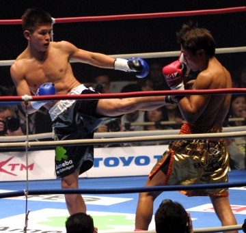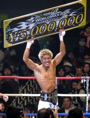 (準決勝のアンディ戦について)ビデオすら見ていなかったけど、前に出てこなかったんで僕のスタイルにハマりました。優弥戦でローが効いていたからラッキーでしたね。 (決勝のHAYATO戦は最初から仕掛けるつもりだった?)そうですね。ノッパデッソーンと駿太(ジムの後輩のMA日本フェザー級王者)と相談して。決勝はKOできたけど、一回戦と準決勝はまだまだですね。こんなんじゃ魔裟斗選手や佐藤選手の足下にも及びません。 (賞金500万円の使い道は?)大学の奨学金の残り200万円を一括で返します。残りはとりあえず両親に何かをプレゼントしたいです。キックでチャンピオンになってからキックに専念するためにアルバイトもしていなくて、ずっと切り詰めた生活をしていたのでうれしいです。優勝できるとは思っていませんでした。(漫才の)M-1で優勝したサンドウィッチマンみたいな心境ですね(笑) (今後について)4月(9日の世界一決定トーナメント開幕戦 広島大会)は絶対に取りこぼさないよう、今回の反省を活かしてもっと練習します。足は痛いけど、行きたかったスノボに行って、20日からタイのノッパデッソーンのジムで練習します(※一夜明け会見では、スノボは中止し療養することを明かした)」