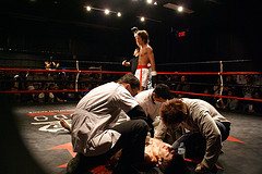 試合開始すぐ菊池は右ストレート3発で梅村を襲うと、梅村も右を返していく。そのままパンチの打ち合いになると菊池が梅村を圧倒し、ロープへ追い詰める。何もできなくなった梅村はただガードするだけとなり、菊池がフック連打すると、梅村は前回の公武堂ファイトで壮絶KO負けを喫した時のようにリングに崩れ落ちた。