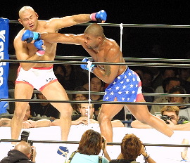 なおPRIDEルールはこの試合のみだが、総合格闘技でお馴染みの顔ぶれが多数出場。松井大二郎 対 シャノン “ザ・キャノン” リッチ(バトラーツルール)、カール・マレンコ 対 バス・ルッテン(UWFルール・左写真)、村上和成 対 ドス・カラスJr.(ルチャルール)、25年前の異種格闘技戦・猪木 vs. アリ戦を再現するような石川雄規 対 モハメド・アリ(・アズーイ/K-1で富平辰文と対戦経験あり・下写真)などが行われた。大会後、社長の石川は既に決定している年内4大会の後にバトラーツの活動を一時休止すると宣言した。この日も客席は3〜4割程度しか埋まらず、経営難が最大の原因のようだ。(レポート&写真:井原芳徳)