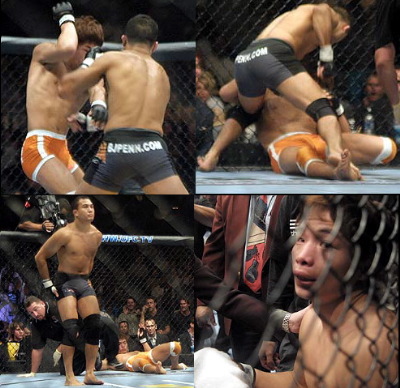 試合開始のブザーとともにダッシュを掛けた宇野は、ひらりと宙に舞った。例によって試合開始の瞬間相手の度肝を抜こうという奇襲攻撃だった。しかし、ペンは落ち着き払ってこれをかわし、冒頭の連続パンチで宇野を圧倒したのだ。フェンスに詰められた宇野には後ろがない。まるで、不良に恐喝される高校生のように為す術もなく、パンチを浴び、気が付くと虚ろな目でマットに腰を落としていた。 たった11秒の惨劇。 うつろな目で宙を眺める宇野の横に立ったペンは、一瞬その呆けたような宇野の顔を見下ろすと、突然恒例の選手インタビューも受けずに楽屋へ走り去っていった。入場も駆け足、そして去るときも。まるで嵐のような男に、宇野は何も出来ないまま蹂躙されてしまったのだった。予想もしなかったKO負けの悲劇を目の当たりにした、セコンドの高阪剛もあまりに突然の惨劇に、苦笑いを浮かべるしかなかった。