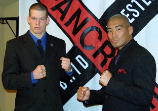 ▼ミドル級キング・オブ・パンクラスタイトルマッチ、ネイサン・マーコート×國奥麒樹真の調印式が22日行われた。両者は2000年9月、12月に対戦しておりマーコートの1勝1分け。王者のマーコートは「この1年間の練習で欠点を全て克服できた」と防衛に自信満々。國奥も「本気の國奥麒樹真を見せます」「これまで毎試合チャンピオンのことを意識しながら戦ってきた。前半が勝負どころ。リーチの長い相手との距離の取り方、組み付いてからの動きがポイントになると思う。KOか一本しか考えていない。判定勝ちではお客さんも満足しないでしょう」と力強く語った。UFC出陣にも色気を見せている國奥。ミドル級ベルトがUFC行きの切符となるだろう。(井原芳徳)
