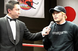 「一心不乱にがんばります。気をそらさないで。(マット・ヒューズの印象は?)物に例えたら牛みたいな選手。突進型なんで、角に刺されないように気を付けます。(タイトルマッチは5分5Rだがスタミナに不安はないか?)バリジャパで8分3Rフルに戦ってるんで特に問題はないと思います。(肘での攻撃が認められているが?)シュートボクシングの時ヒジを練習していたので、UFC限定でやってみたいです。(中尾受太郎もUFCに参戦するが?)二人で力を合わせて、日本の修斗は強いんだ、というのをアピールしたいと思います。勝ってきますんで生還できたら皆さんよろしくお願いします。」