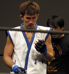 ◆ 早川コメント 「(感想は?)やろうと思ってたことが何もできなかったですね。(芹沢は)凄く気合いが入っていた選手でしたね。スパーリングいくつもこなしてるんですけど、やっぱり実戦経験が。(パンチを)食らっても、いつ殴り返していいかタイミングはかれなかったり。まあ、経験不足としか言い様がないですね。(止められた時の状態というのは?)たぶん、最初ラッシュもらった時に目ん玉ん中にパンチもらっちゃって、こっち(左目)見えなくなっちゃったんですよ。で、(1R終わって)平さんに『おかしいですね』って言った時に、平さんにこれ(指を目の前に示し、見えているか確認する仕種)やられて。 スパーリングではここまで殴りあわないですから。寝技やりながら、『これはラウンド中に回復するんだろうか?』と考えてました。『このまま立ったら危ないだろうな』という判断はできたんですけど。(2Rも戦いたかった?)そうですね。止められるとは思ってなかったんで。僕的には『こんなの(総合では)よくあることなのかなあ?』と思ってたんですよ。でも止められた後に平さんに『やめなきゃだめだった』と言われたんで、平さんには感謝しています。 (これからの課題は?)今終わったばっかりなんでまだわからないですね。ただ、流れっていうんですかね、一発もらったらどこで攻守を(返せばいいか)、というのが(わからなかったので)経験積まなきゃ駄目ですね。切り返しどころが全然わからないですね。ラッシュ食らっちゃうと。そのことでやっぱ寝技も、リングでやるのとロープがあるのと(で違いますね)。プロ柔術とかで慣れてたんですけどね。足も全然リングに噛んでなかったですから、ツルツルと。そういうところも全然甘かったですね。」(このまま早川は検査に向かった)
