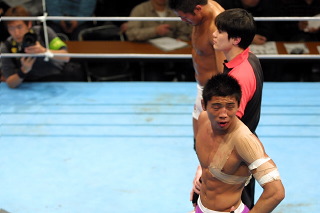 練習中の怪我で左肩を負傷した上山は技に切れがない。一方三崎もデビュー当時の思いきりの良さが見られなかったためか、両者とも決め手を欠いたまま、漫然とポジションを入れ換えあう一戦となった。試合後判定に上山が首を傾げていた。