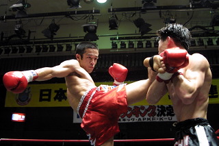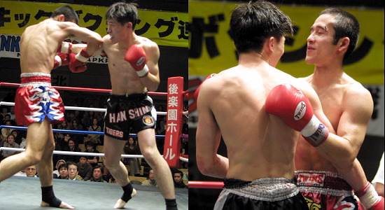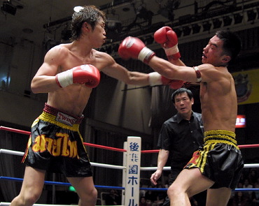 タイ帰りの木浪が磐石の強さを見せた。前回、強打者小野寺亮(神武館)を破った試合巧者宮本に、前半からほとんど技を出す間もなく重いロー、左右フックを浴びせていき、1ラウンド終盤には右ハイキックで早くもダウンを奪う。 その後も一方的な展開のまま迎えた最終ラウンド、気合を出しながら前に出てきた宮本に肘をもらった木浪が大流血し、あわやの場面がみられたが、この時既に終了30秒前。続行後そのまま試合終了のゴングがなり、木浪が大差判定で勝利した。