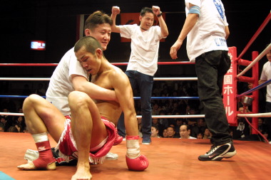 (ダウンを奪ったのは右フックですか?)覚えてないですね。多分右だと思います。(前半肘をもらっていたようですが?)そうですね。1Rに自分のパンチにカウンターで肘を合わせられて鼻血が出てヤバイなと思ったので、パンチを4Rまで封印してワザと出さないようにしました。4Rで出したら相手が疲れてたみたいで『当たるんだあ』と思いました。