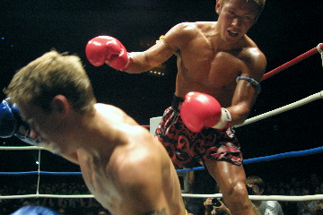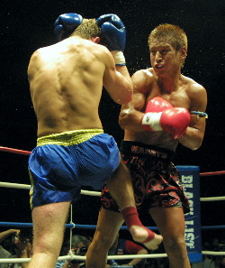試合は魔裟斗が最近一番自信があるという右ロー中心に、単発の攻撃が目立つ滑り出しとなった。対するベン・バートンはWMTCライトウェルター級オセアニアチャンピオンという触れ込みの選手で、これまでにも二回にわたって一カ月程のタイキャンプを張り、ラジャダムナンスタジアムでも戦った経験があるという。当然スタイルは完全にムエタイスタイル。ミドルキックと右パンチの伸びがあり、顔面が開き気味の魔裟斗にそのフックをヒットさせる展開もみられたが、基本的に倒せるパンチを持った選手ではない。序盤から魔裟斗の繰り出す右ローをガード出来ず、腿を赤く染めながら踏みこたえる姿が目についた。事実、ラウンド終了間際には、魔裟斗の右のショートフックでぐらつき、コーナーに詰められて勝負あったかという気配になったが、ここはゴングに救われた。ところが、ここからがオーストラリア人選手らしいタフネスの見せどころだった。2R以降鼻血を流し、嵐のように魔裟斗のローを浴びつつ、ハーパーはリングに立ち続ける。ミドルにはミドルを、また魔裟斗得意の左フックにも右のクロスを返そうとするなど、いまいちコンビネーションに冴えの見られない魔裟斗の出来を差し引いても、結構な粘りを見せて頑張るのである。