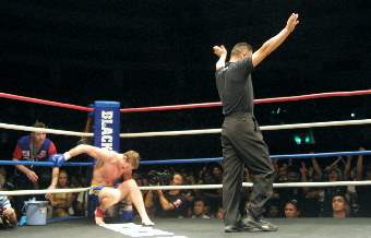 勝負が動いたのは4Rだった。得意の左をジャブに使って、リズムを変えた魔裟斗の右ストレートがハーパーの顔面を打ち抜いたのだ。選手生活初だという右でのダウンを奪い、傘にかかった魔裟斗は続いて右ミドルを使って注意を上に反らし、そこに効果的な右ローを畳み込んで二つ目のダウンを導いたのだった。ここまで我慢に我慢を重ねたハーパーだが、ついにここで力尽きた形となりマットに四つんばいになった状態での10カウントを聞くことになった。