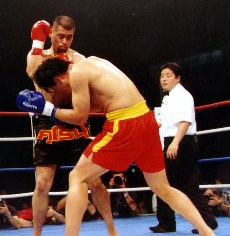 散打独特のサイドキックで大石を突き放す安虎。大石は組んで膝へとつなぐを首相撲からブレイクの展開が続く。離れた距離で大石はローを入れていく。安虎の出足が鈍ったように見えたが、2R安虎のパンチで大石が額から出血。ドクターチェックが入り、大石は試合続行不可能と判断されたため、1R終了しているため試合自体は成立し、ストップまでのポイントが集計された。その結果3者20-20のドローとなったため試合続行可能な安虎が勝利扱いとなり、2回戦進出を決めた。 結果一覧に戻る ← 前の試合 / 次の試合 →