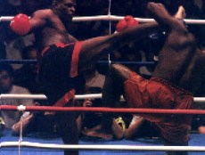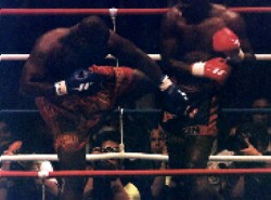 ヴァン・ダムがジリジリと前に出始めるが、Mr.パーフェクト・ホーストは要所要所で集中打を集めてヴァン・ダムを押し戻す。軽めのパンチ・コンビネーションでヴァン・ダムを両腕ガードの内側に閉じこめておいてからローキックを見舞う、というのがホーストの対ヴァン・ダム用戦法のようだ。「ロイドのガードは確かに堅いが、あの守り方だとスムーズに次の反撃に繋げていくのが難しい。」