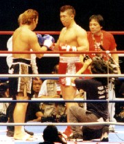 直接的な攻撃を出さず、じわじわと前に出ることで威圧する佐竹と、ステップワ−クで自分の間合を保つ武蔵。レフェリ−から「もっと打ち合うように」という注意が両者に与えられる。しかし一度固まってしまった試合のリズムはもはや容易には変わらない。