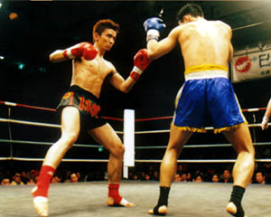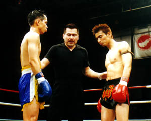 3R両者カウンターの打ち合い、山口の左ミドルに貝沼の左フック、貝沼の左ミドルに山口の左ストレート。相打ちが続く。業を煮やした貝沼が膝蹴りから一気に攻めようとコーナーへ押し込んで突進するとガードの下がったところに山口乾坤一擲の左肘。これで貝沼の額がざっくりと切れ、ドクターチェックにより続行不可能の判断が下され山口が紙一重の勝利を収めた。