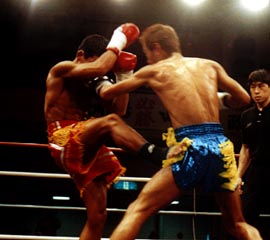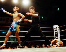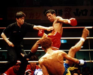 両者は98年の6月に1度対戦しており、その時は深津が4度のダウンを奪った末に5度目のダウンでKO勝ちしている。だから今回も楽勝防衛のムードが漂っていたが、そうはいかないのが新日本キックのタイトルマッチなのだ。新日本キックには、チャンピオンである者とそうでない者とに厳然たるヒエラルキーが存在する。出場機会も、メディアへの露出も、そして出場報酬も王者になると格段に跳ね上がる。それだけに全ての選手が目の色を変えて王座を目指し、王者は何としてでもこの座を守ろうとする。タイ人やランキング戦では味わえない緊迫感があるのはその為だ。そしてこの一戦も期待に違わぬ(そしてある意味期待を裏切る)激戦となった。