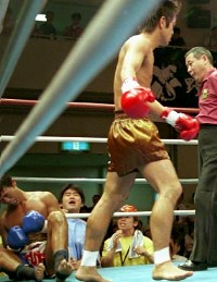 しかし、プレッシャーは明日華のほうに強くかかっていたのだろうか。試合開始直後、ミドルを繰り出した明日華に対し、ロー一発でリングの空気を持っていってしまった小林はいつもの左右に揺れる構えからプレッシャーをかけていく。明日華はカウンターを合わせたいところだがなかなか前に出ていけない。1分をすぎたころ、明日華のパンチで小林が尻餅をつく。これを機にペースをつかめれば良かったのだが、直後小林のフック、ロー、ボディの連打にダウン。そのままKOとなった。