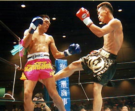 ピニットはムァンファーレグと違いパンチはあまり得意な方ではない。鷹山のパンチに対しモハメド・アリばりにロープをうまく使ってかわし、左右のミドルを返していく。