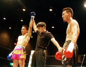 コーナーに下がりつつも決定打は許さず、要所要所でロー、ハイをヒットさせる。ラスト30秒、鷹山のパンチをダッキングして避け、カウンターの右。前進を止めない鷹山に、さらにテンカオ、ハイキックを当てガッツポーズ。